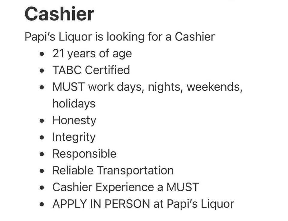Cashiers Needed in Both Locations Back to Employment Opportunities Cashiers Needed in Both Locations By Papi's Liquor, LLC & Papi's Liquor #2 3/26/2026 Images × Share × Email Facebook LinkedIn X Pinterest Powered By GrowthZone