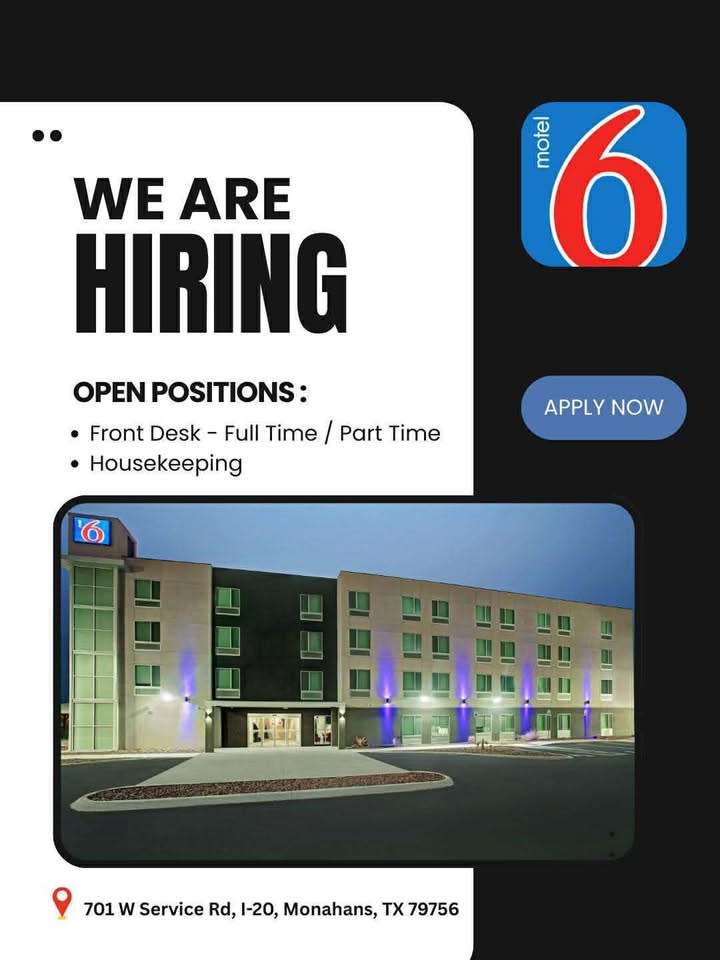 Different Positions Available Back to Employment Opportunities Different Positions Available By Motel 6 1/5/2026 Front Desk - Full time/ Part timeHousekeeping Images × Share × Email Facebook LinkedIn X Pinterest Powered By GrowthZone